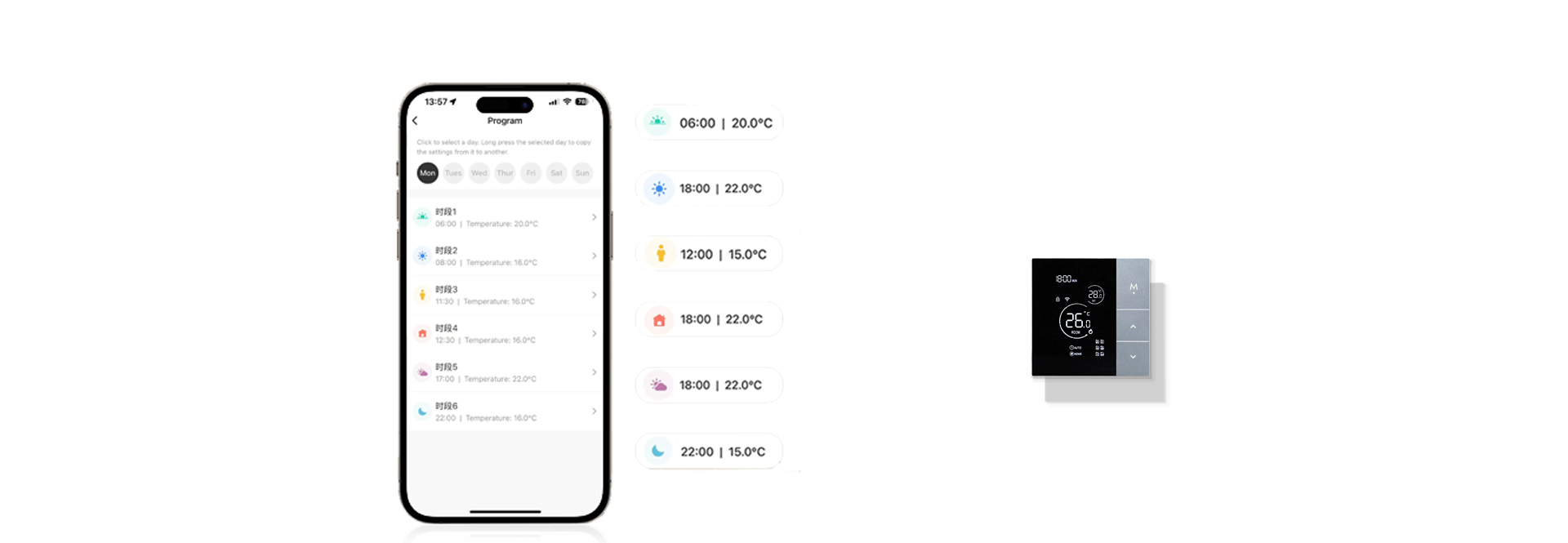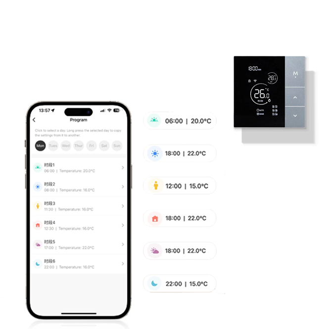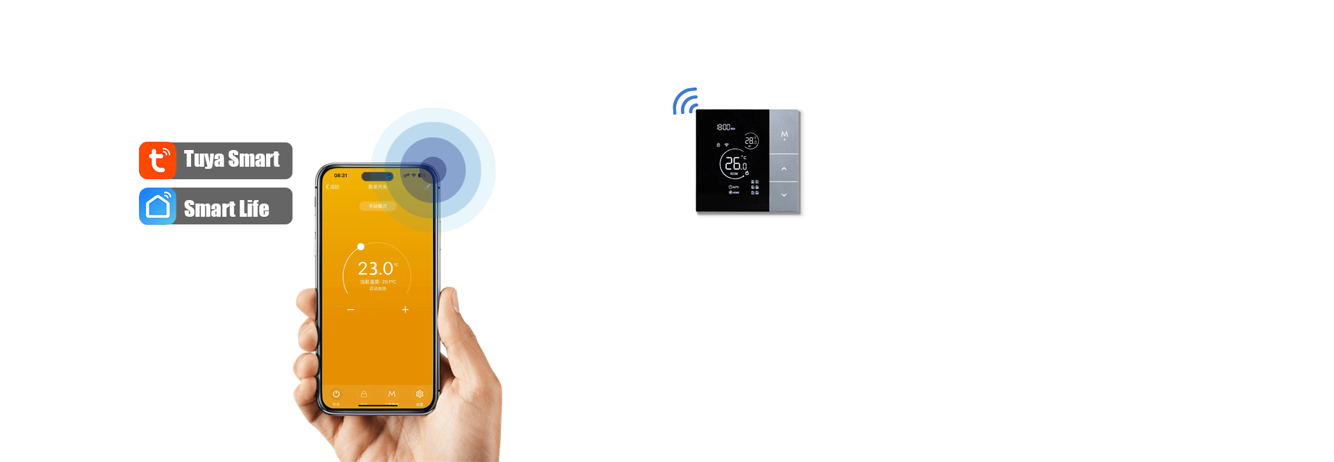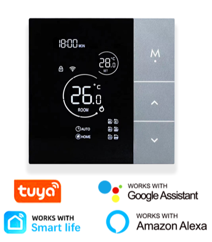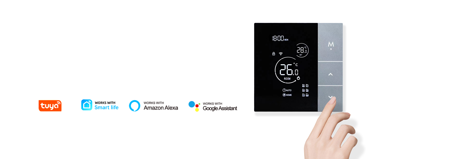 This smart thermostat ensures precise and reliable temperature control. It is compatible with mainstream voice assistants and supports remote control via the Tuya APP. The scratch-resistant backlit touch screen enables clear visibility, while manual/automatic dual modes flexibly adapt to different scenarios. With dual sensors for ±1℃ accuracy and 6 daily programmable settings, it also includes power-off memory and child lock functions for both convenience and safety.