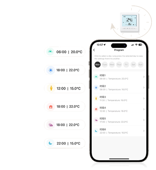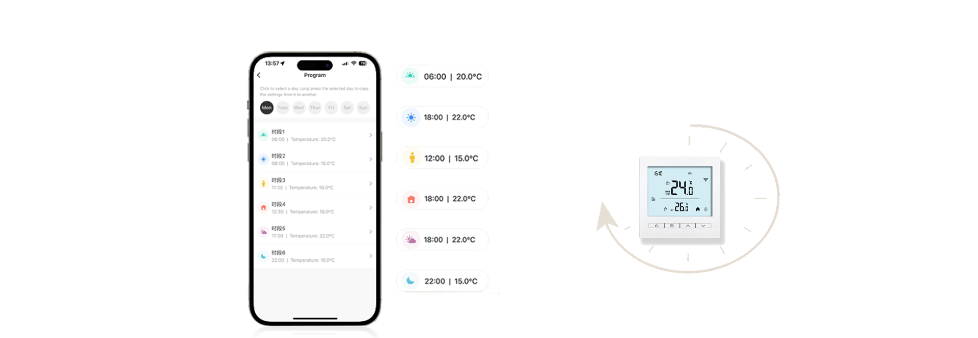 Supports different temperature settings: 5+2 / 6+1 / 7-day programming