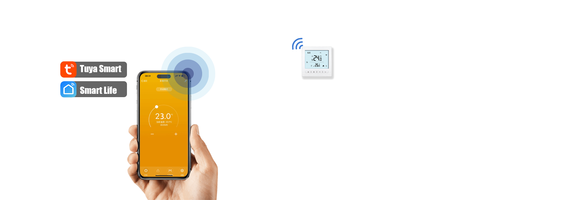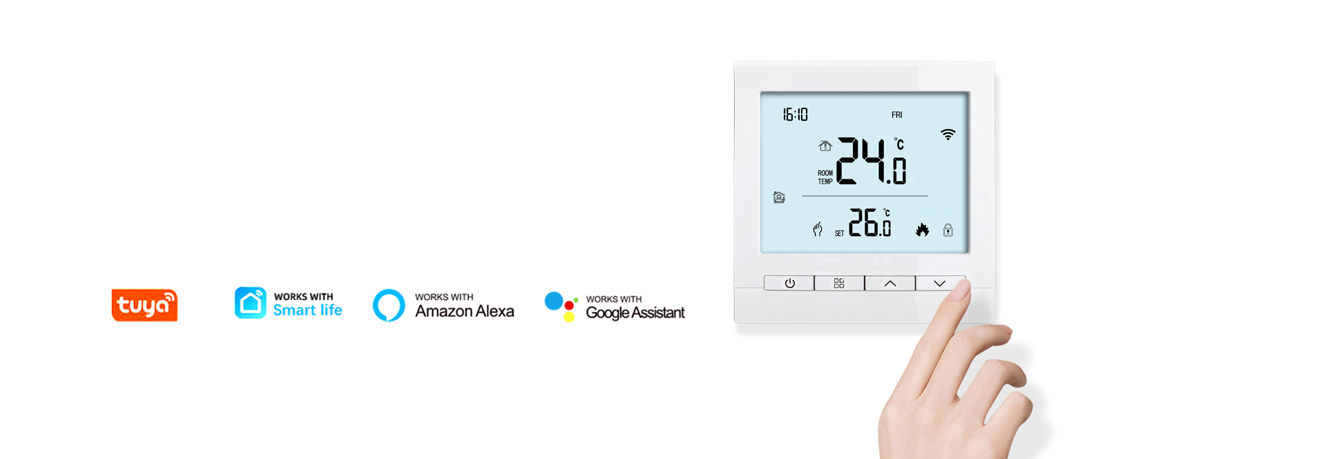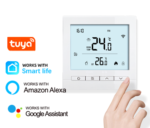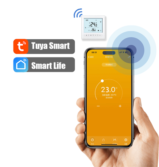 This smart thermostat ensures precise and reliable temperature control. It is compatible with mainstream voice assistants and supports remote control via the Tuya APP. The scratch-resistant backlit touch screen enables clear visibility, while manual/automatic dual modes flexibly adapt to different scenarios. With dual sensors for ±1℃ accuracy and 6 daily programmable settings, it also includes power-off memory and child lock functions for both convenience and safety.