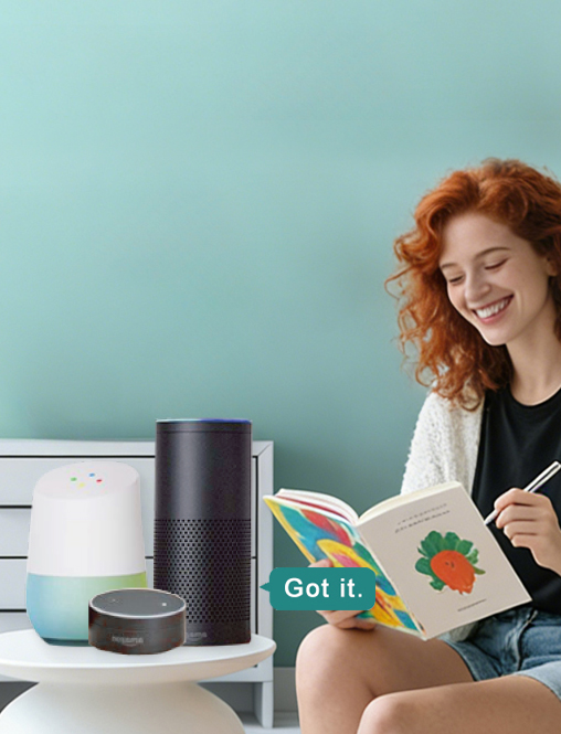 It works with Amazon Alexa and Google Home, so can be controlled by our sounds, but we need to add the Beok Home Skill first.