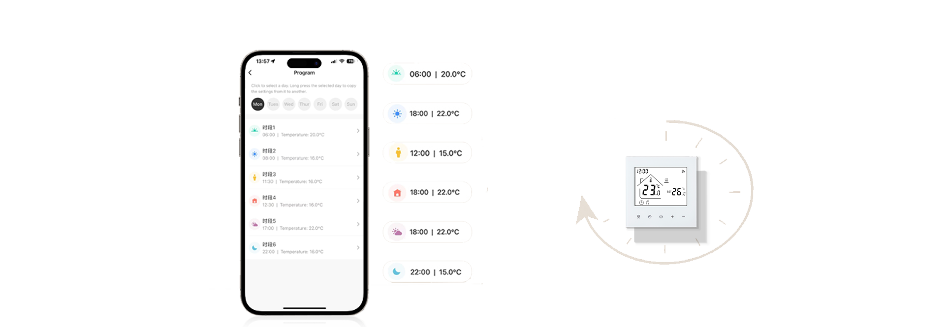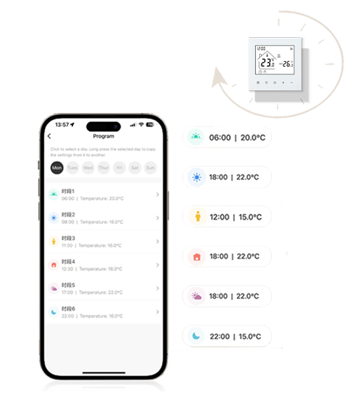 Supports different temperature settings: 5+2 / 6+1 / 7-day programming