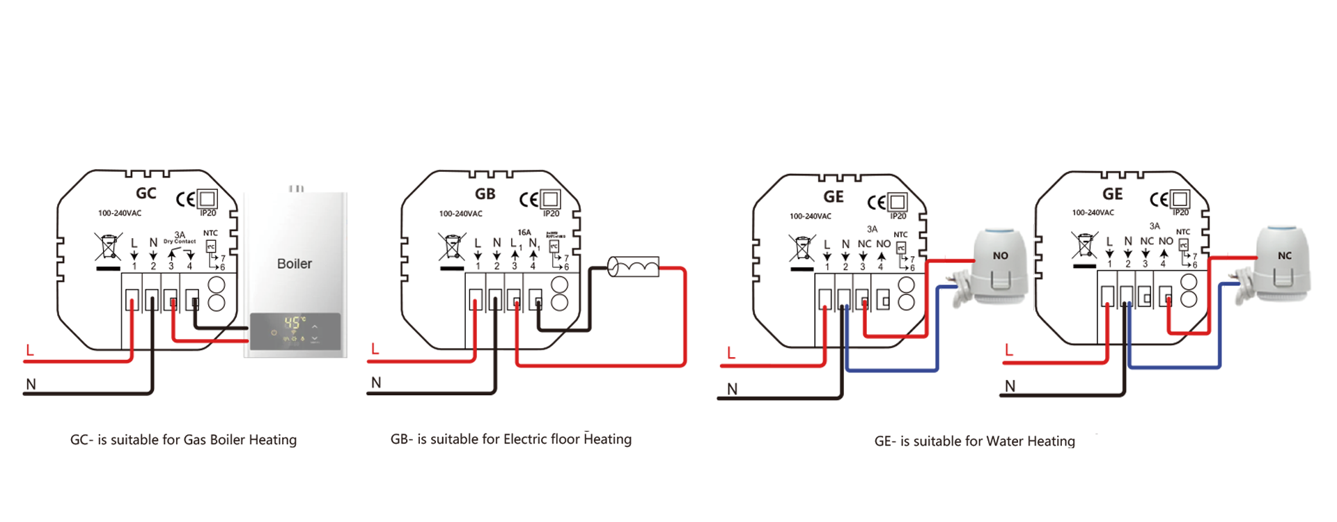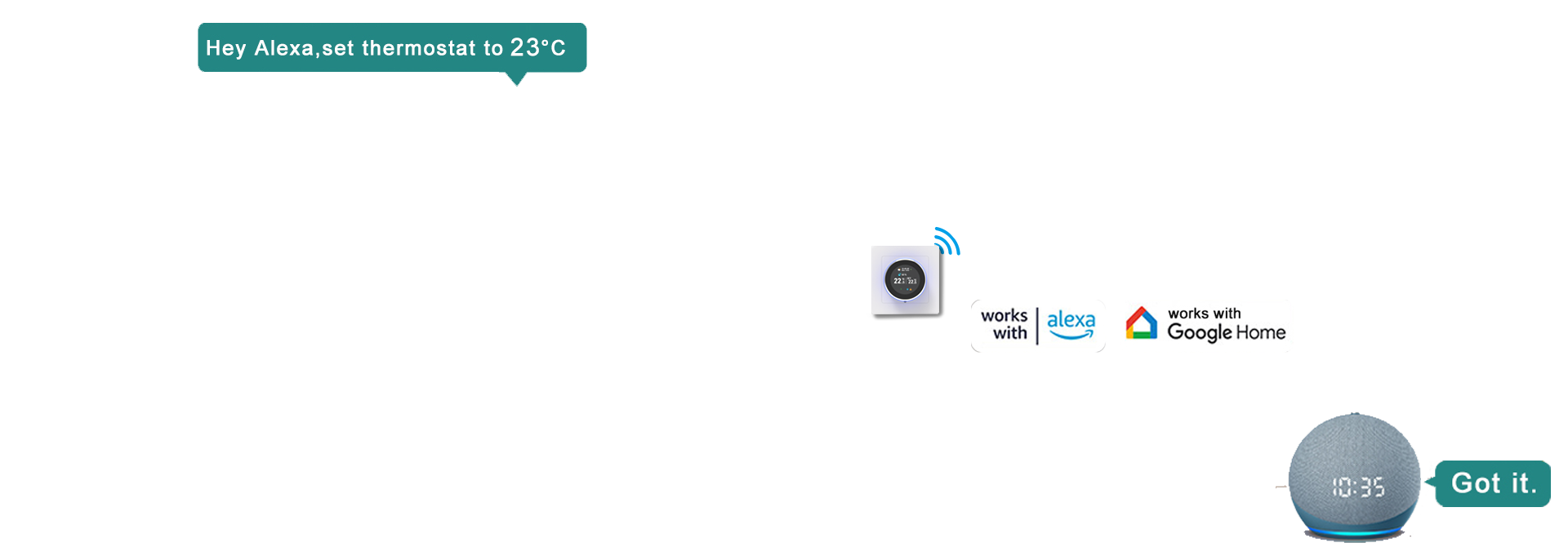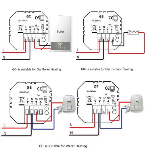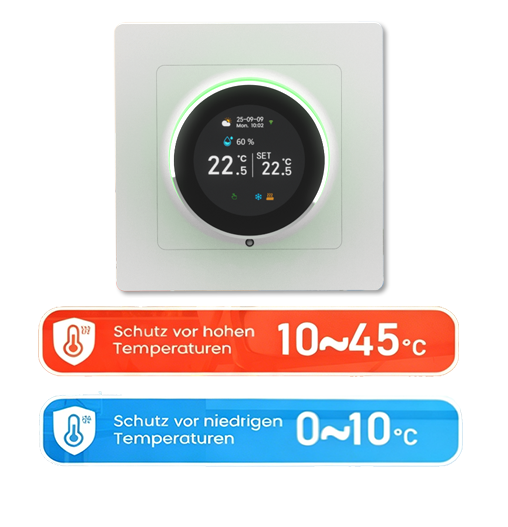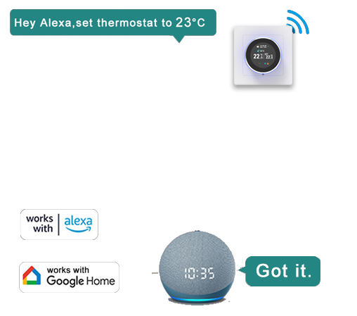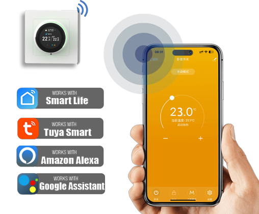 This thermostat features APP remote control and voice control, equipped with a clear LED display and sensitive touch buttons. It connects stably via 2.4GHz WIFI, supports programmable schedules, dimmable ambient lighting, and includes a child safety lock, fully meeting your needs for intelligence, convenience and safety.